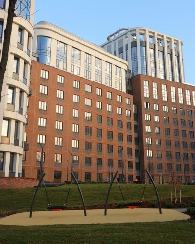 Сложная конструктивная форма дома в виде чаши придает ему незабываемые очертания. Разноэтаэжные секции, витражное остекление, многообразие текстурных отделочных материалов – все это делает КМ Дом на Барминской таким невероятным.