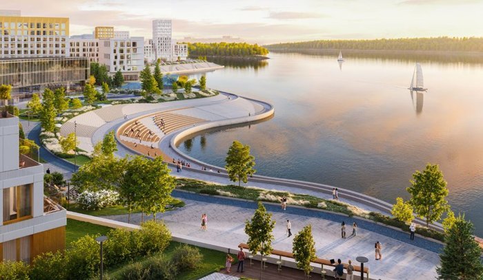 Маловысотные дома с видами на реку и дома с фасадами в виде парусов. А рядом - многофункциональная набережная с променадом, зонами для медитации и йоги, упирающаяся в любимейшую пляжную зону всех нижегородцев и во все века прекрасная река