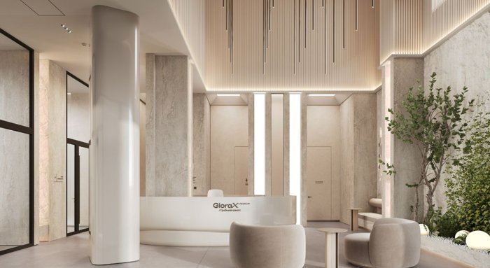 Многослойная композиция фасадов из светлого облицовочного камня с металлическими панелями создает игру света и тени, словно продолжая движение водной глади. Камень и стекло, металл и воздух, линии и плоскости здесь не противопоставлены, а объединены в единую симфонию.