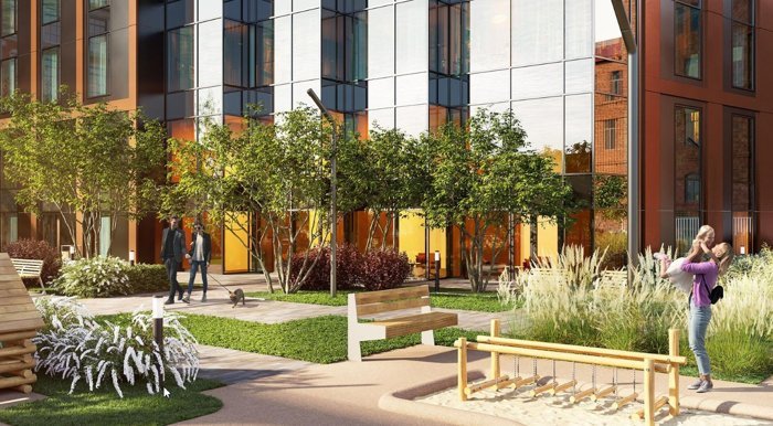Закрытый двор на стилобате с концепцией природного ландшафта — это всегда хорошие виды.
